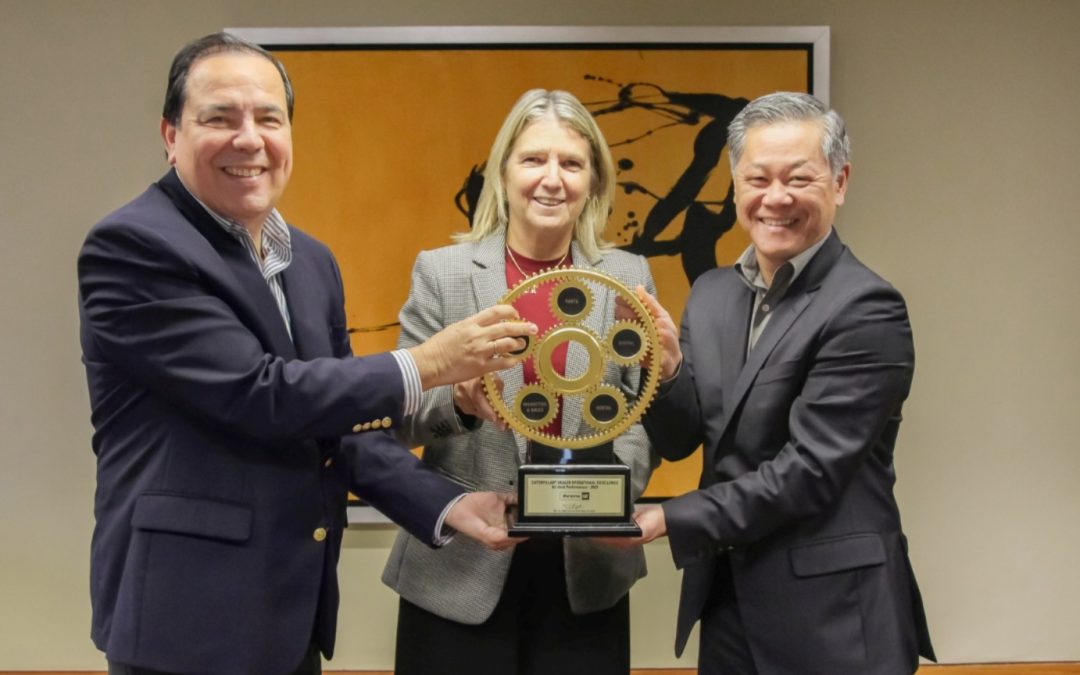 Denis Saito, Director of Distribution at Caterpillar Inc., presented the award to Mariela García de Fabbri, General Manager of Ferreycorp, and Gonzalo Díaz Pró, General Manager of Ferreyros.