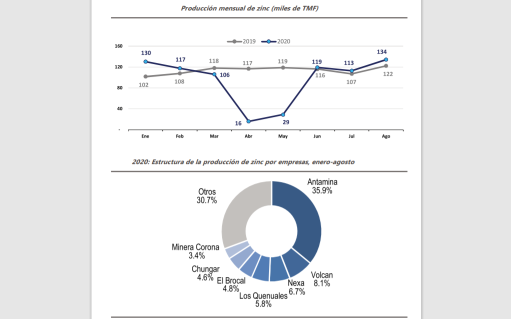 (02-10-2020) Si bien la producción metálica, está volviendo a la senda de la recuperación con repuntes considerables en el mes de agosto último, con respecto al mes anterior, sobresaliendo el hierro (+29.2%), oro (+19.7%) y los polimetálicos: zinc (+18.6%), plata (+16.9%) y plomo (+7.9%), los resultados acumulados al octavo mes del año reflejan todavía un importante desbalance con respecto al mismo periodo