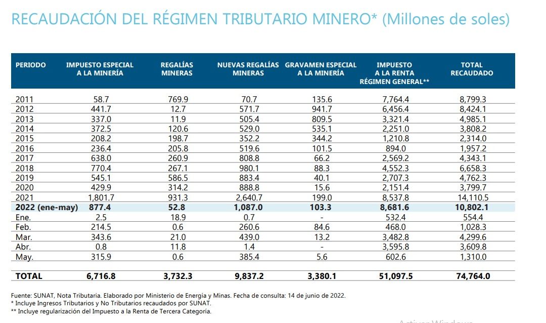 (27-07-2022) Entre enero y mayo de 2022, las transferencias por canon minero, regalías mineras, y derecho de vigencia y penalidad, sumaron en conjunto S/ 10,802 millones, cifra superior a lo recaudado anualmente cada año entre 2011 y 2020.